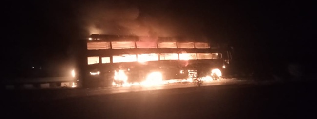 लेकिन यात्रियों के दबाव के बाद बस को रोका गया और सभी यात्री बस से बाहर निकले। बस शिवगुरु कंपनी की बताई जा रही है। जबतक लोग कुछ समझ पाते बस धू-धू कर जलने लगी।