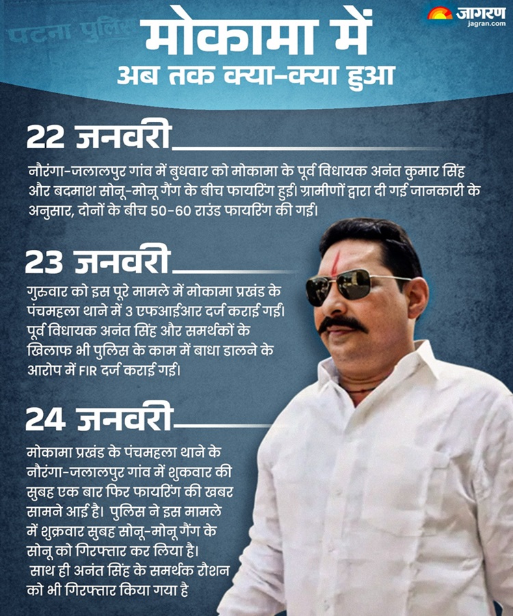 बता दें कि मंगलवार को मोकामा के पूर्व विधायक अनंत कुमार सिंह और बदमाश सोनू-मोनू गैंग के बीच हुई फायरिंग मामले में बुधवार को थाने में तीन प्राथमिकी कराई गई थी।