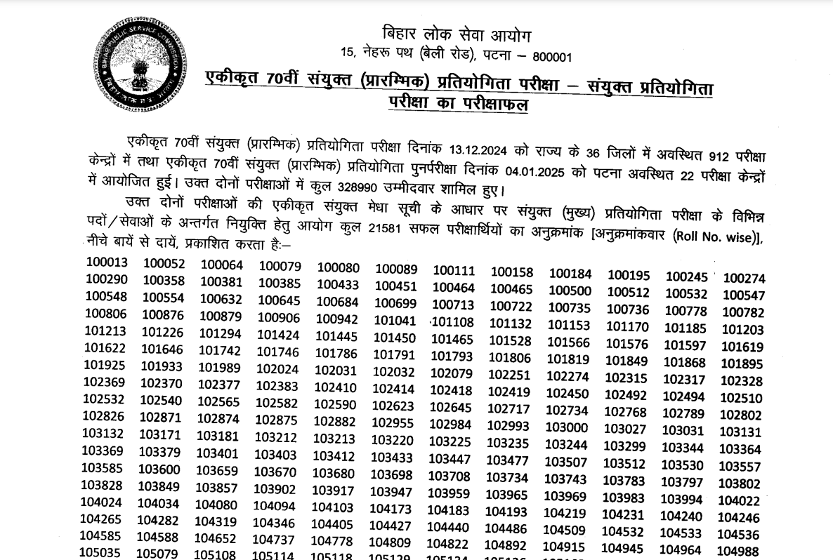 बिहार लोक सेवा आयोग (बीपीएससी) ने 70वीं संयुक्त प्रारंभिक प्रतियोगिता परीक्षा का परिणाम (BPSC 70th Prelims Result) जारी कर दिया है। इसमें 21 हजार 581 अभ्यर्थी सफल घोषित किए गए हैं। मुख्य परीक्षा का आयोजन अप्रैल में संभावित है। 13 दिसंबर को बापू परीक्षा परिसर में परीक्षा के दौरान अव्यवस्था की स्थिति के कारण परीक्षा को रद कर दिया गया था।