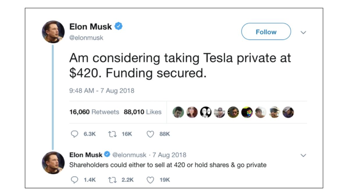 मस्क एक बार टेस्ला से संबंधित मामले में भी कानूनी लड़ाई लड़ चुके हैं। 2018 का एक ट्वीट है, जिसमें मस्क ने लिखा था कि उन्होंने कंपनी को 420 डॉलर प्रति शेयर पर निजी बनाने के लिए "फंडिंग सिक्योर्ड" कर ली है।
