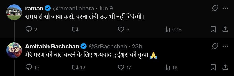 एक यूजर ने अमिताभ बच्चन के पोस्ट पर कमेंट करते हुए लिखा, "समय से सो जाया करो, वरना लंबी उम्र भी नहीं टिकेगी।" इसका जवाब देते हुए 82 साल के अमिताभ ने कहा, "मेरे मरण की बात करने के लिए धन्यवाद। इश्वर की कृपा।"
