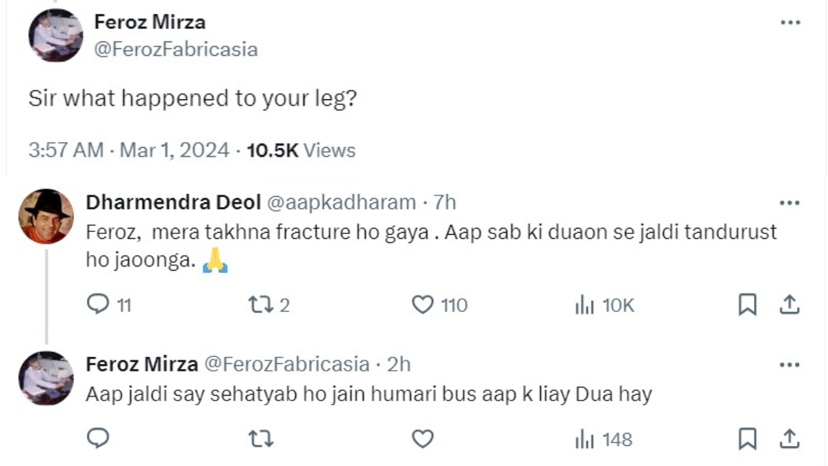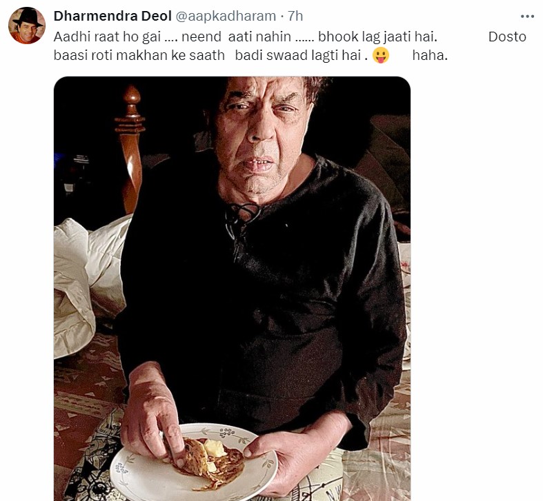 धर्मेंद्र ने एक्स पर पोस्ट शेयर करते हुए कैप्शन में लिखा, "आधी रात हो गई... नींद आती नहीं...भूख लग जाती है। दोस्तों बासी रोटी मक्खन के साथ बढ़ी स्वाद लगती है। हा हा हा।" अभिनेता का ये पोस्ट जैसे ही सोशल मीडिया पर सामने आया उनके फैंस ने तुरंत रिएक्ट किया। हालांकि, धर्मेंद्र ने भी अपने चाहने वालों को जवाब देने में देर नहीं की। कमेंट करते हुए कई फैंस ने एक्टर की अच्छी सेहत और लंबी जिंदगी के लिए दुआं भी की।