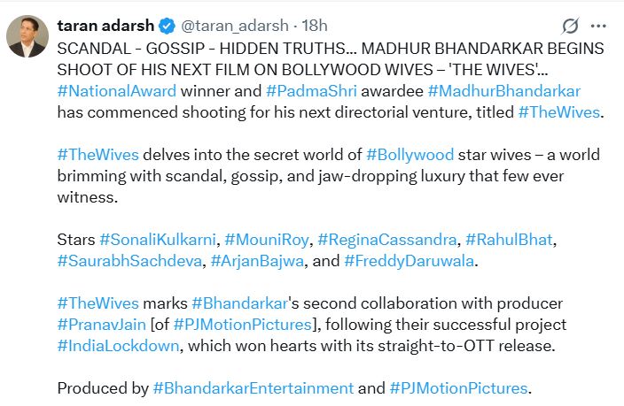 ट्रेड एनालिस्ट तरण आदर्श ने अपने आधिकारिक इंस्टाग्राम अकाउंट पर एक पोस्ट शेयर करते हुए मधुर भंडारकर की अगली फिल्म का एक पोस्टर शेयर किया है। इसके साथ ही उन्होंने कैप्शन में लिखा, "स्कैंडल, गॉसिप और छुपे हुए सच...मधुर भंडारकर ने बॉलीवुड वाइव्स पर अपनी अगली फिल्म 'द वाइव्स' की शूटिंग शुरू कर दी है। द वाइव्स बॉलीवुड स्टार्स की पत्नियों की जिंदगी के एक ऐसे सच को उजागर करती है, जिसके बारे में बहुत ही कम लोग जानते हैं"।