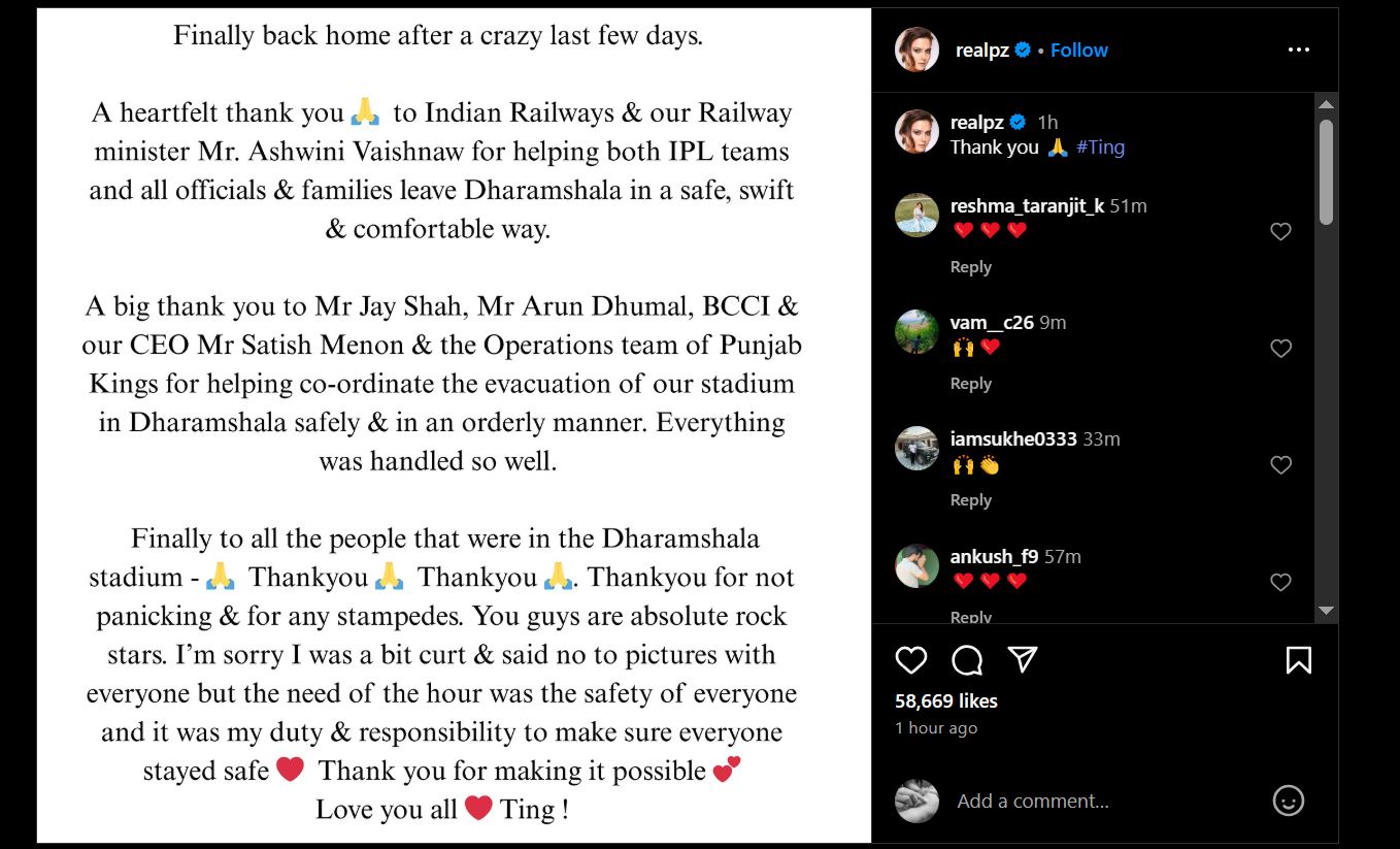 प्रीति ने इंस्टाग्राम पर एक लंबा नोट लिखकर भारतीय रेलवे और रेल मंत्री अश्विनी वैष्णव का धन्यवाद किया, जिन्होंने दोनों आईपीएल टीमों, अधिकारियों और उनके परिवारों को धर्मशाला से सुरक्षित निकालने में मदद की। दोनों टीमें, कोचिंग स्टाफ और प्रसारण दल को 40-50 छोटे वाहनों में होशियारपुर ले जाया गया, जहां से उन्हें जालंधर रेलवे स्टेशन के रास्ते दिल्ली के लिए विशेष ट्रेन में भेजा गया। कांगड़ा की पुलिस अधीक्षक शालिनी अग्निहोत्री ने इसकी पुष्टि की। प्रीति ने बीसीसीआई, जय शाह, अरुण धूमल, और पंजाब किंग्स के सीईओ सतीश मेनन को भी धन्यवाद दिया है।