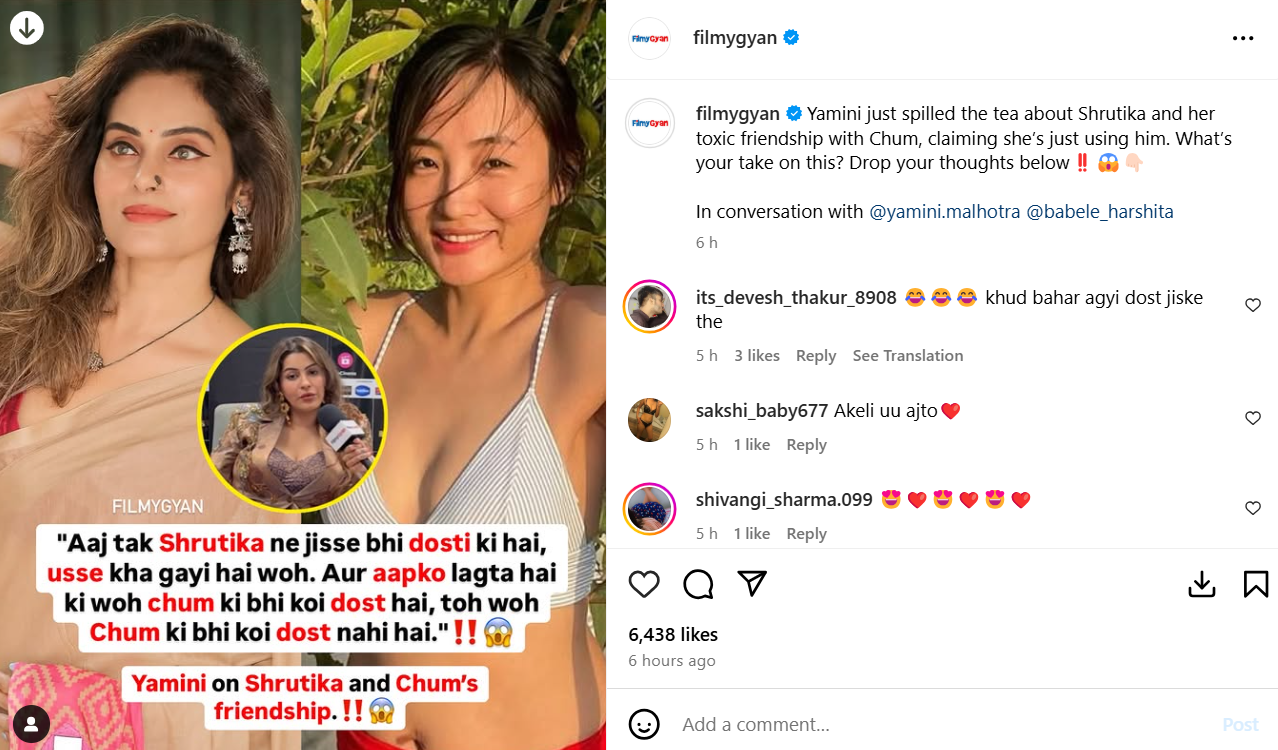 वहीं इस बीच मिड वीक में दिग्विजय राठी के एविक्शन ने सभी को चौंकाकर रख दिया। इसके बाद आखिरी वीकेंड के वॉर में एलिमिनेशन की तलवार दो अन्य कंटेस्टेंट पर गिरी। एडिन रोज और यामिनी मल्होत्रा को शो से बाहर कर दिया गया। अब शो से निकलने के बाद यामिनी कई सारे इंटरव्यू में श्रुतिका पर अपनी भड़ास निकाल रही हैं और भर भर के जनता के सामने उनकी असली चेहरा रिवील करने की कोशिश में लगी हुई हैं।
