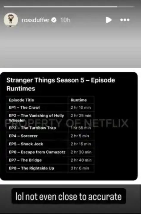इस पोस्ट के वायरल होते ही शो के को-क्रिएटर रॉस डफर ने अपने आधिकारिक इंस्टाग्राम अकाउंट पर एक स्टोरी पोस्ट करते हुए एपिसोड्स लीक होने की खबर को गलत बताया और लिखा, "लोल...जो बताया है उसके आसपास नहीं है"। इस सीरीज के डायरेक्टर शॉन लेवी ने इससे पहले बताया था कि स्ट्रेंजर थिंग्स 5 के कई एपिसोड्स फीचर लेंथ वाले हैं।