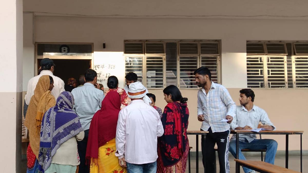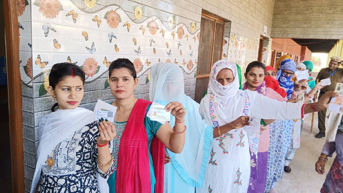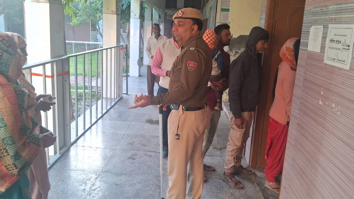 झज्जर के बेरी में मतदान केंद्र पर अपनी बारी का इंतजार करते हुए मतदाता।