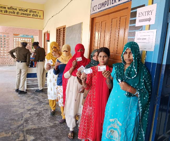 गुरुग्राम के गांव समसपुर के सरकारी स्कूल में बनाए गए बूथ पर लगी मतदाताओं की लंबी लाइन।
