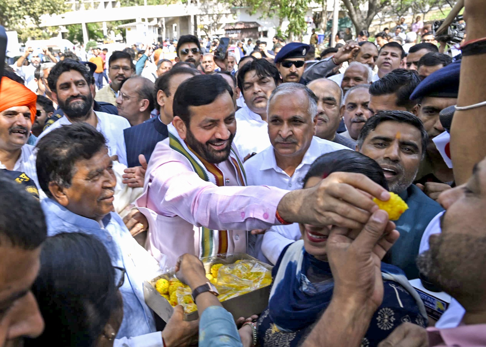 फोटो कैप्शन: सीएम नायब सैनी कार्यकर्ताओं का मुंह मीठा करते हुए