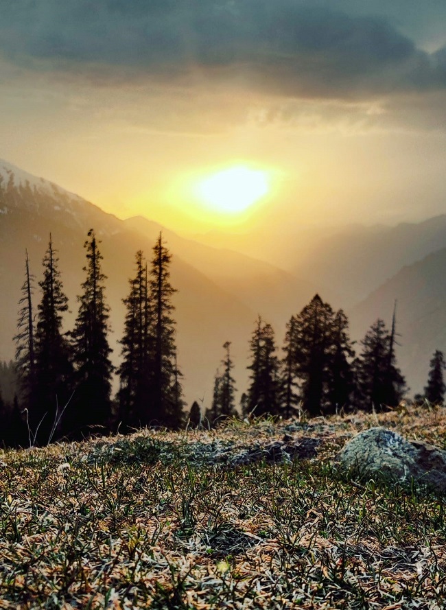 कुल्लू जिले की पार्वती घाटी में कलगा-बुनबुनी-खीरगंगा ट्रैक के टाप पर पहुंचने पर दिखता सूर्यास्त का दृश्य। सौजन्य : विवेक