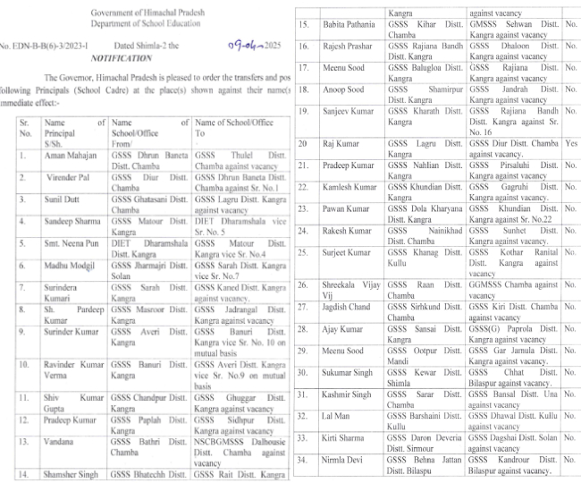 हिमाचल में प्रिंसिपल के ट्रांसफर से जुड़ा आदेश सरकार ने लिया वापस, लिस्ट में 61 नाम थे शामिल