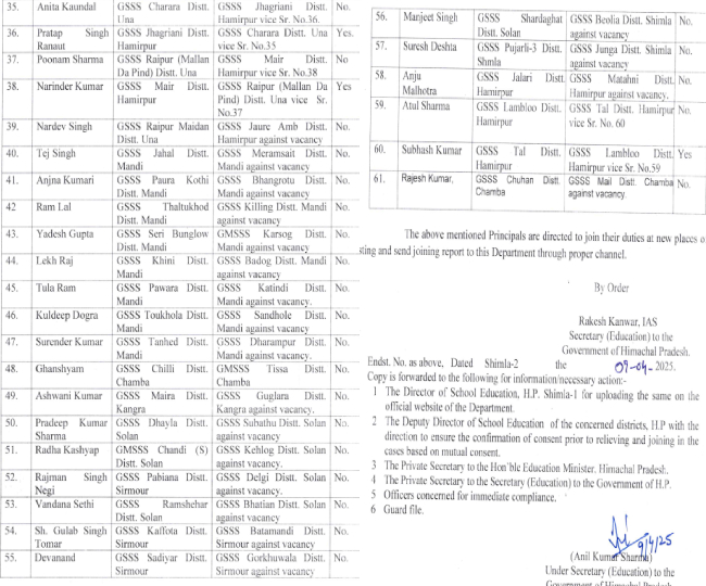 बुधवार को सचिव शिक्षा राकेश कंवर की ओर से इस संबंध में आदेश जारी किया गया था, जिसमें कहा गया कि सभी प्रधानाचार्य को निर्देश दिए हैं कि वह जल्द अपने पदों पर ज्वाइन करें व इसकी रिपोर्ट स्कूल शिक्षा निदेशालय को भेजे।