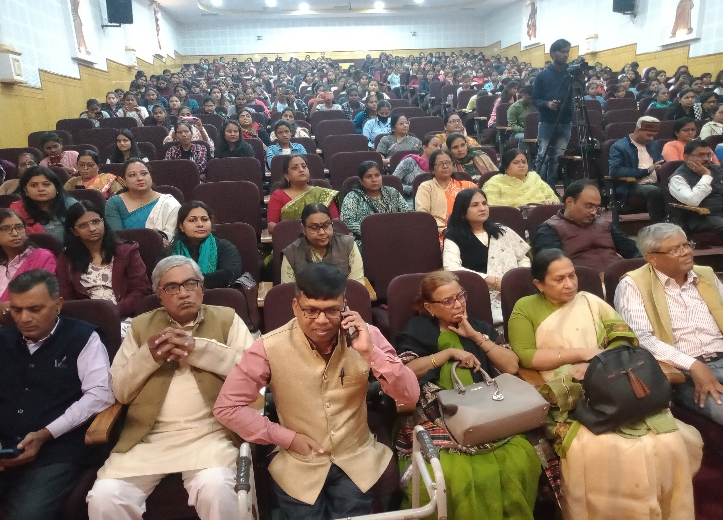 एमएनपीएस के सभागर में बिरसा मुंडा व्याख्यानमाला के दौरान मंचासीन पदाधिकारी, कुलगीत गाती छात्राएं व संगीत शिक्षक।
