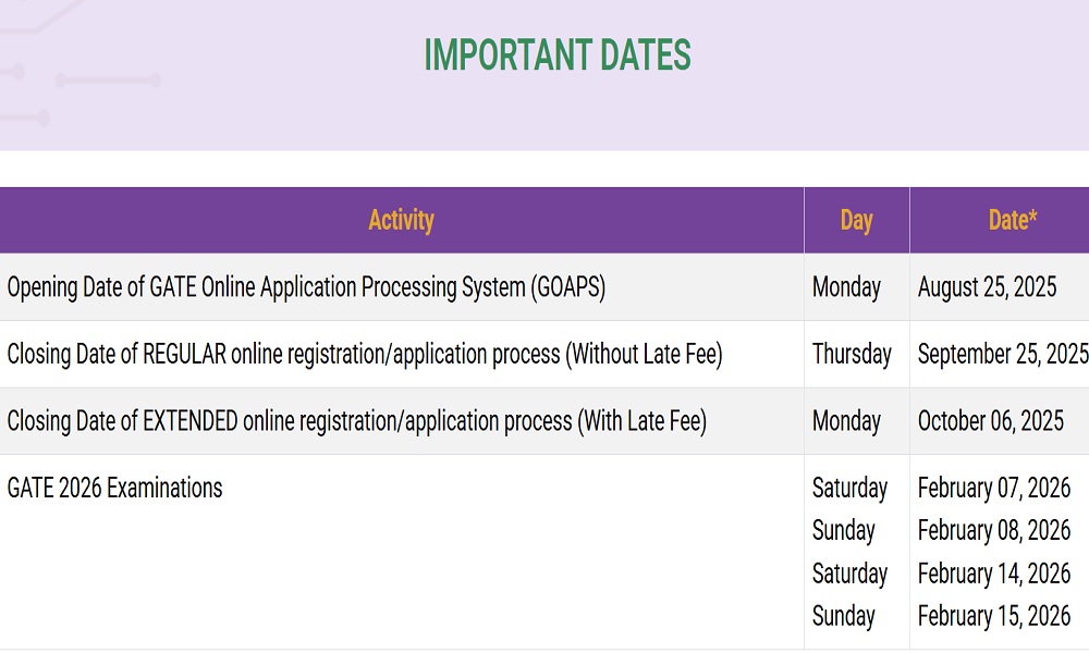 गेट 2026 एग्जाम में भाग लेने के लिए 25 अगस्त से स्टार्ट हो जायेंगे। बिना लेट फीस के एप्लीकेशन विंडो 25 सितंबर तक एवं लेट फीस के साथ विंडो 6 अक्टूबर तक जारी रहेगी।