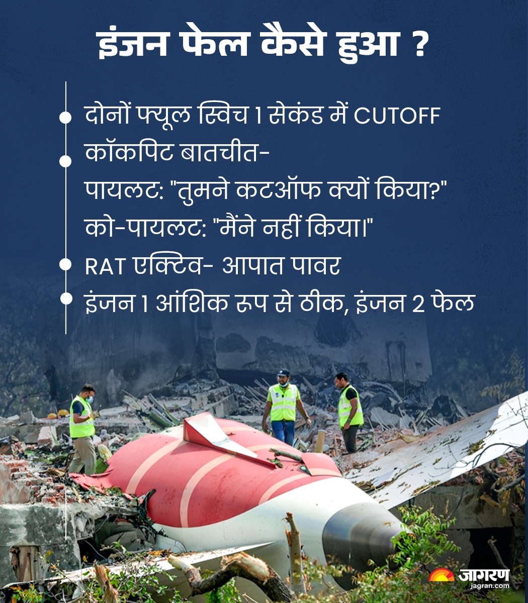 AAIB की 15 पन्नों की रिपोर्ट के मुताबिक, विमान के दोनों इंजन टेकऑफ के कुछ सेकेंड के बाद ही बंद हो गए थे। फ्यूल की सप्लाई अचानक रुक गई, क्योंकि जोनों इंजनों के कटऑफ स्विच एक सेकेंड के अंतर में RUN से CUTOFF पर चले गए।