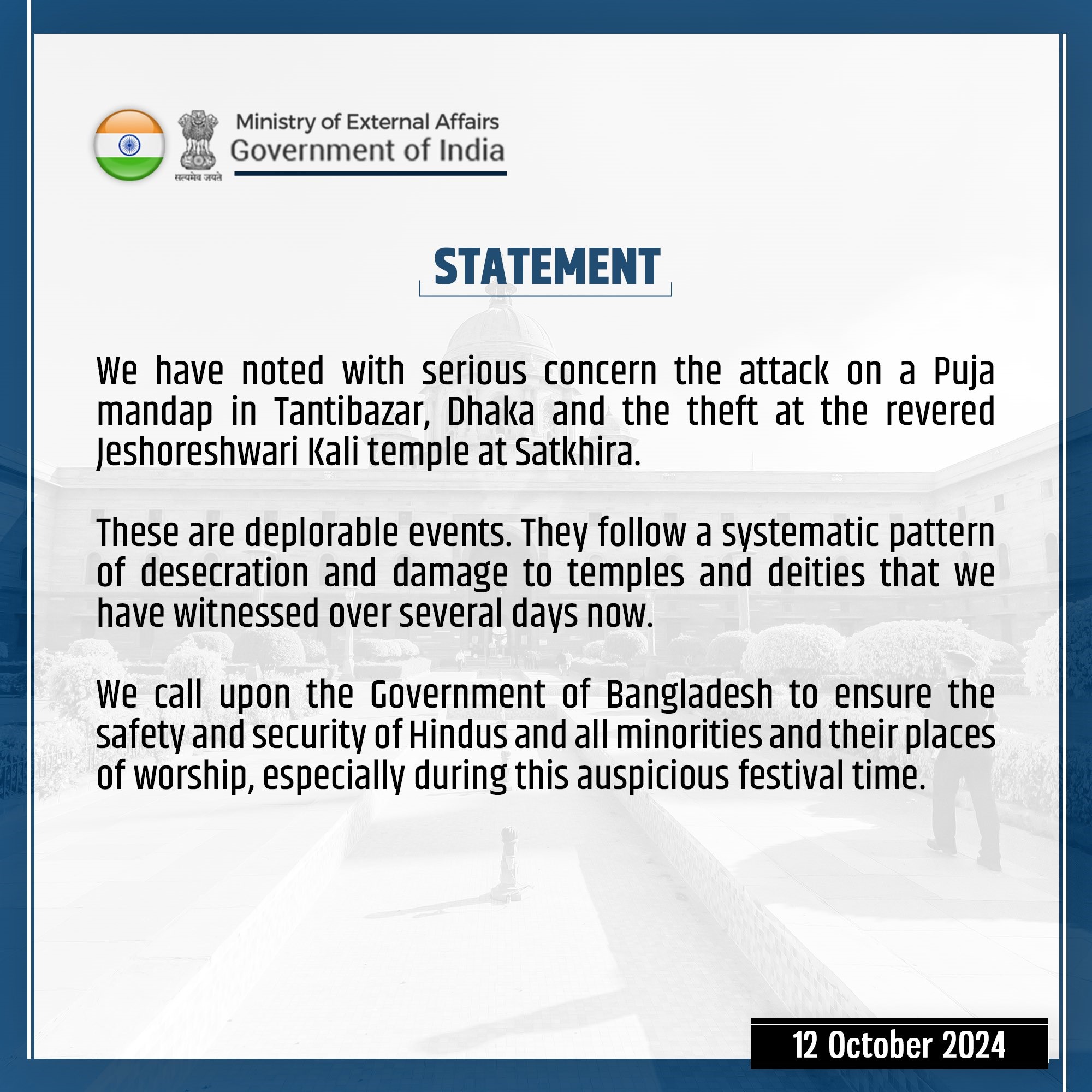 विदेश मंत्रालय ने कहा, 'हम बांग्लादेश सरकार से हिंदुओं और सभी अल्पसंख्यकों और उनके पूजा स्थलों की सुरक्षा सुनिश्चित करने का आह्वान करते हैं, खासकर इस शुभ त्योहार के समय।'