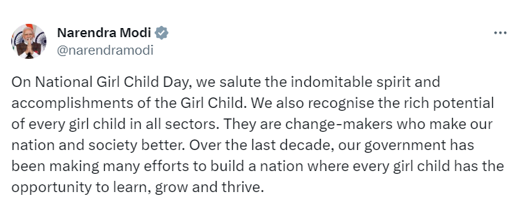 प्रधानमंत्री मोदी ने लिखा- 'राष्ट्रीय बालिका दिवस पर हम बालिकाओं की अदम्य भावना और उपलब्धियों को सलाम करते हैं। हम सभी क्षेत्रों में प्रत्येक बालिका की समृद्ध क्षमता को भी पहचानते हैं। वे परिवर्तन-निर्माता हैं, जो हमारे देश और समाज को बेहतर बनाती हैं। हमारी सरकार एक ऐसे राष्ट्र के निर्माण के लिए कई प्रयास कर रही है, जहां प्रत्येक बालिका को सीखने, बढ़ने और फलने-फूलने का अवसर मिले।'