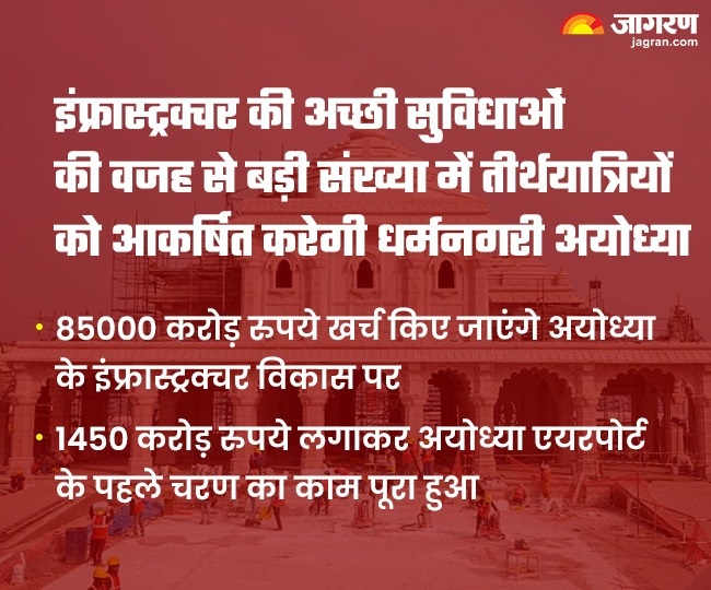 रिपोर्ट के मुताबिक, अयोध्या में मंदिर निर्माण से लेकर अन्य इंफ्रास्ट्रक्चर के विकास पर 850 अरब रुपए खर्च किया जाना है। इनमें लगभग 18 अरब रुपए राम मंदिर के निर्माण पर खर्च किए गए हैं। 14.5 अरब रुपए लगाकर अयोध्या एयरपोर्ट के पहले चरण का काम पूरा किया गया और इस प्रकार के तीन और टर्मिनल का निर्माण किया जाना है। अभी सालाना 10 लाख तो दूसरे चरण का काम पूरा होने के बाद सालाना 60 लाख यात्री अयोध्या हवाई जहाज से आसानी से आ-जा सकेंगे।