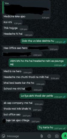 इस पर कर्मचारी ने जवाब दिया, "मैं डोलो लेता हूं और देखता हूं।" थोड़ी देर के बाद उसने बताया कि सिरदर्द अब भी जारी है, लेकिन मैनेजर ने दोबारा दबाव डालते हुए लिखा, "दवा लो हीरो, सिरदर्द के लिए छुट्टी नहीं मिलती। अब तुम स्कूल में नहीं हो, कंपनी का हिस्सा हो।"