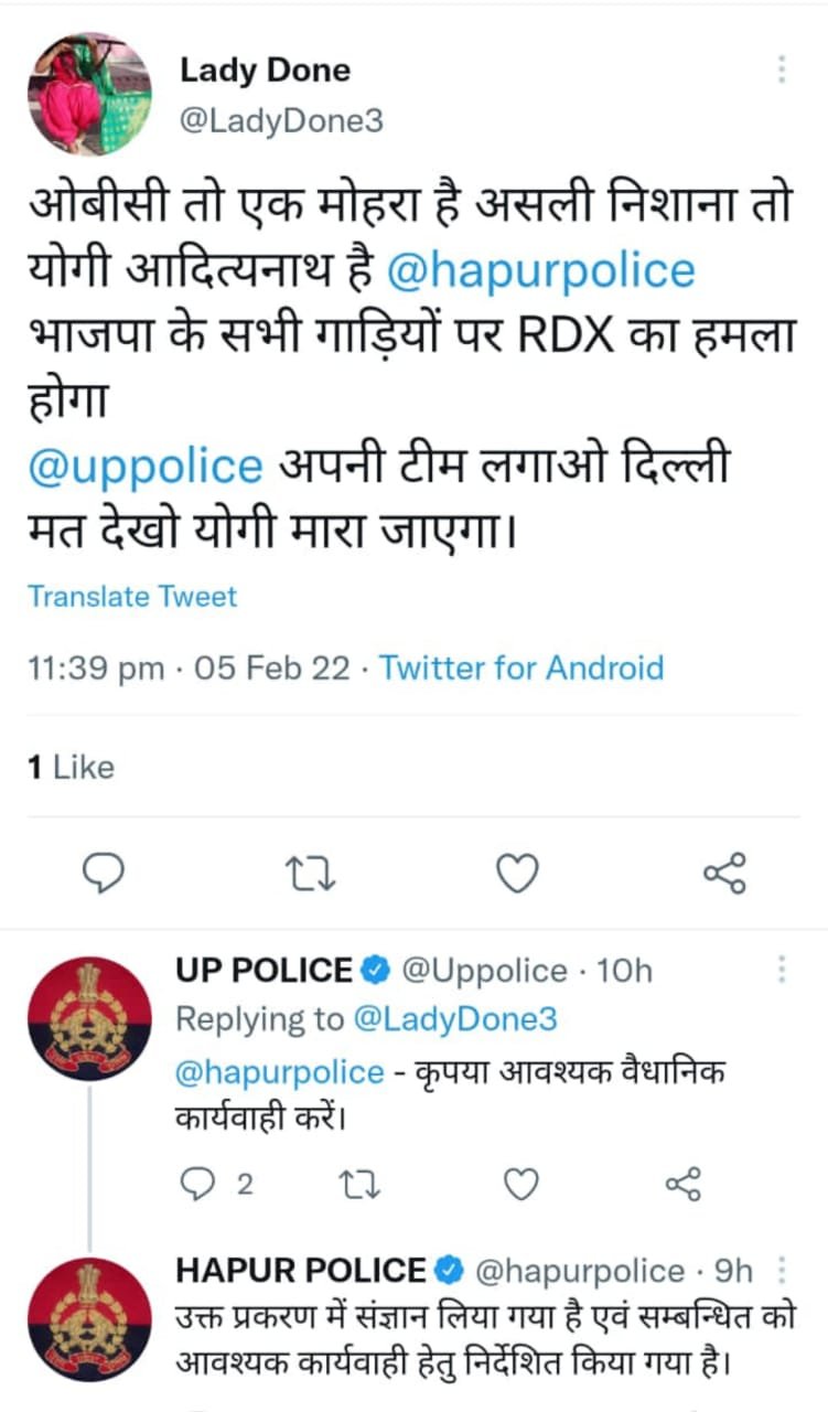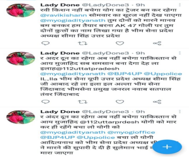 ट्विटर पर लेडी डान के नाम बने एकाउंट से किए गए ट्वीट में आरोपित ने लिखा है कि ओवैसी तो मोहरा है, असली निशाना तो योगी आदित्यनाथ है। भाजपा नेताओं की गाड़ियों पर आरडीएक्स से हमला होगा। अपनी टीम लगाओ। दिल्ली मत देखो। योगी मारा जाएगा। इसके बाद हापुड़ पुलिस ने ट्वीट कर वैधानिक कार्रवाई करने की बात कही। जिसके बाद दोबारा द्वीट किया गया। जिसमें आरोपित ने भीम सेना की अध्यक्ष सीमा सिंह, योगी आदित्यनाथ को मानव बम बनकर मारने की बात लिखी। इतना ही नहीं पाकिस्तान से आए मुजाहिद के शमशान बनाने की धमकी भी ट्वीट के जरिए दी है।