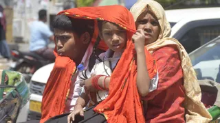 UP Weather: धूप से बच्चों को बचाती मां। जागरण
