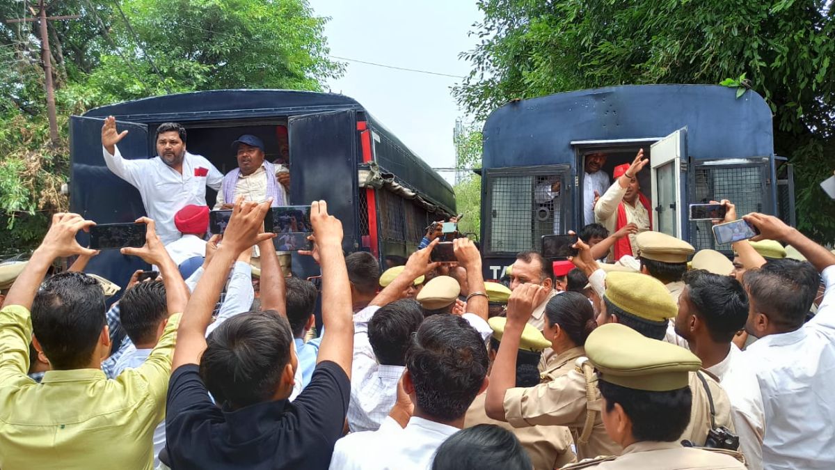 पीलीभीत में कार्यालय खाली कराने के विरोध में हिरासत में सपा नेता। जागरण