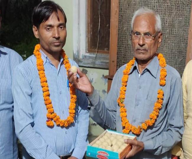 नीतू गुप्ता का मुंह मीठा कराते पिता फूलचंद गुप्ता