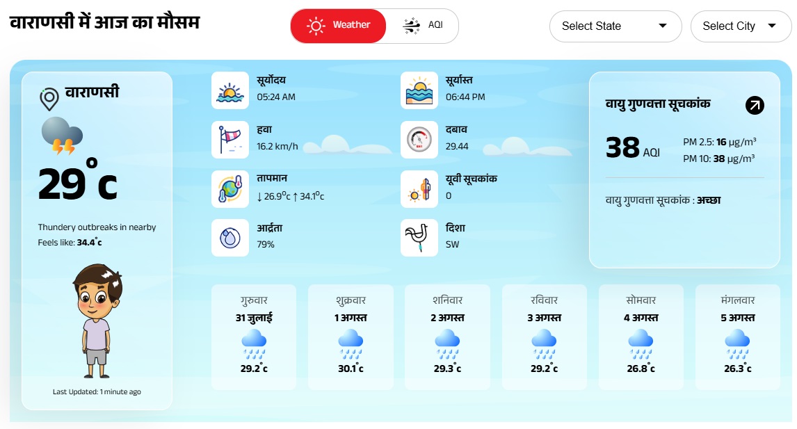 बीते चौबीस घंटों में वाराणसी में बादलों की आवाजाही का रुख बना रहा और दिन चढ़ने के बाद उमस के स्तर में इजाफा भी हो रहा है। जबकि वातावरण मे जहां नमी के स्तर में बढ़ोत्तरी हुई वहां पर बूंदाबांदी के हालात भी बने हैं।
