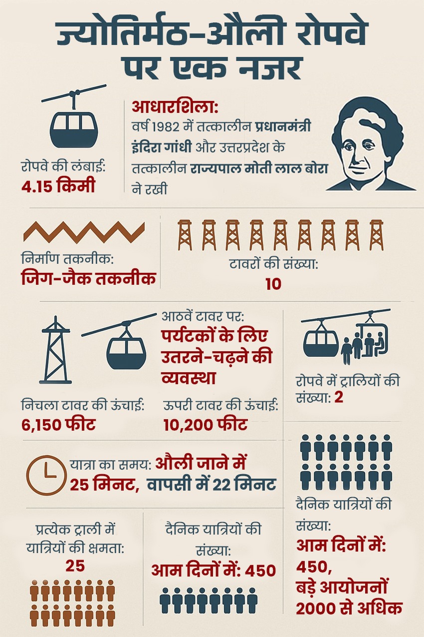 - 4.15 किमी लंबे ज्योतिर्मठ-औली पैसेंजर रोपवे की आधारशिला वर्ष 1982 में तत्कालीन प्रधानमंत्री इंदिरा गांधी और अभिभाजित उत्तरप्रदेश के तत्कालीन राज्यपाल मोती लाल बोरा ने रखी थी।