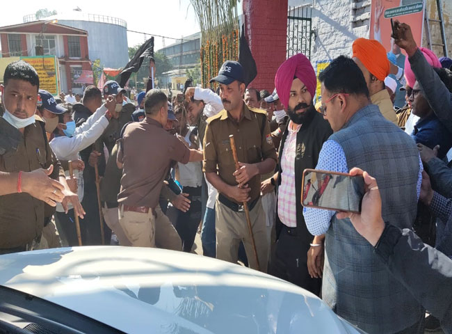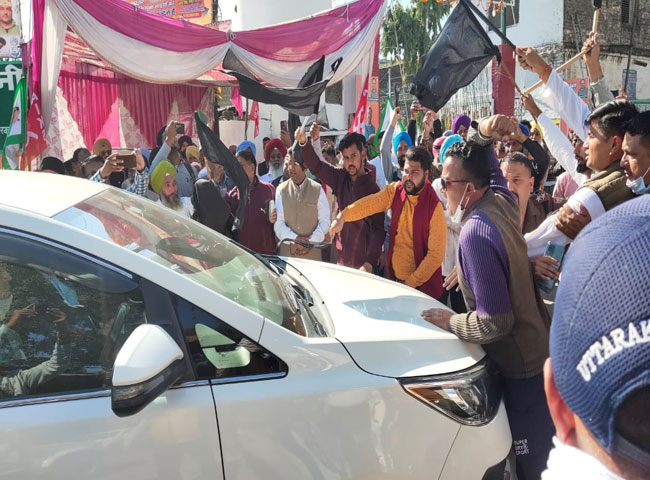 PICS: पेराई सत्र के उद्घाटन को पहुंचे पूर्व सीएम त्रिवेंद्र का विरोध, किसानों ने दिखाए काले झंडे; गाड़ी को भी रोका