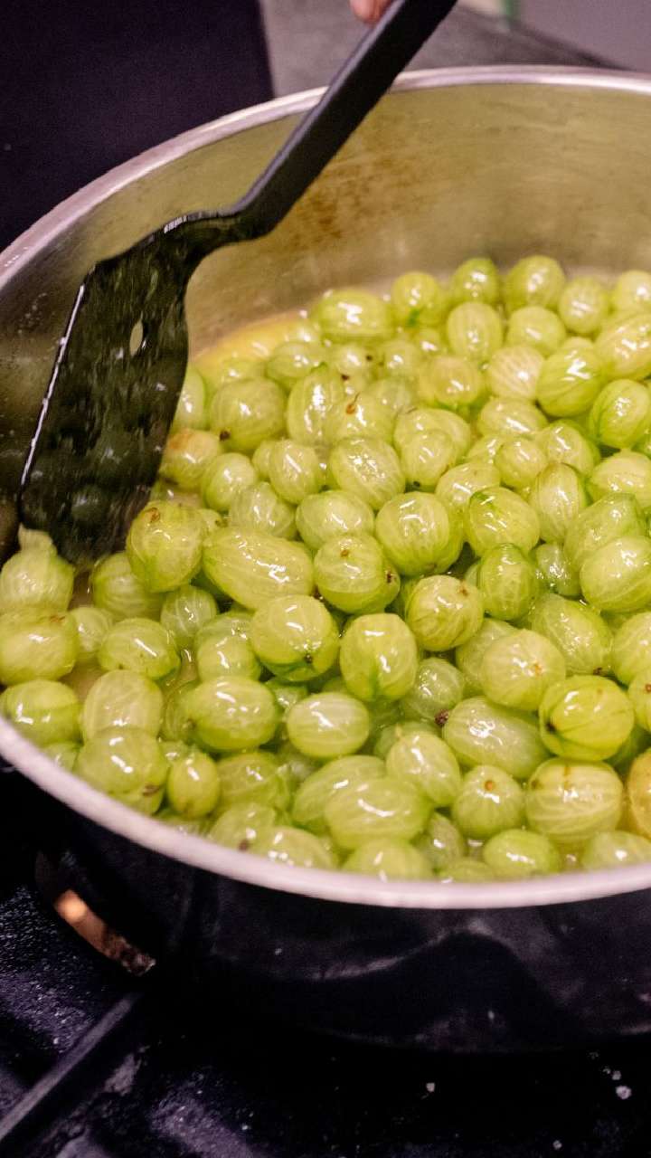 अब इस चाशनी में उबले हुए आंवले डालें और धीमी आंच पर 10–15 मिनट पकाएं। चाशनी हल्की गाढ़ी होने लगे तो गैस बंद कर दें।
