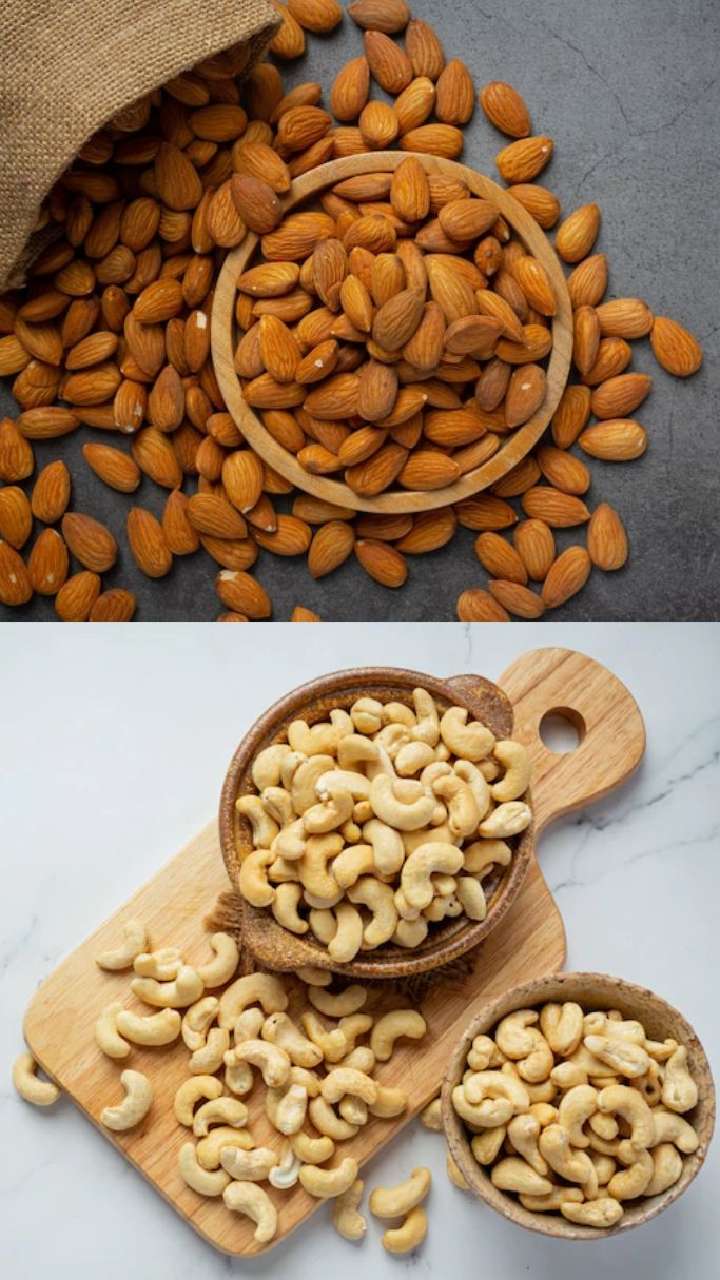 खीर को गार्निश करने के लिए, काजू और बादाम काट लीजिये, इसमें चिरौंजी और किशमिश भी मिला दें।