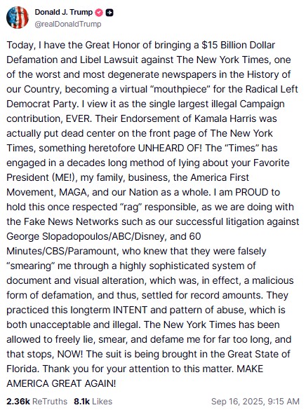 डोनाल्ड ट्रंप ने सोशल मीडिया पर पोस्ट शेयर करते हुए लिखा, "आज द न्यूयॉर्क टाइम्स के खिलाफ 15 बिलियन डॉलर का मानहानि का मुकदमा किया है। ये अमेरिका के सबसे घटिया अखबारों में से एक है, जो अब रेडिकल डेमोक्रैट पार्टी का वर्चुअल माउथपीस बन गया है।"